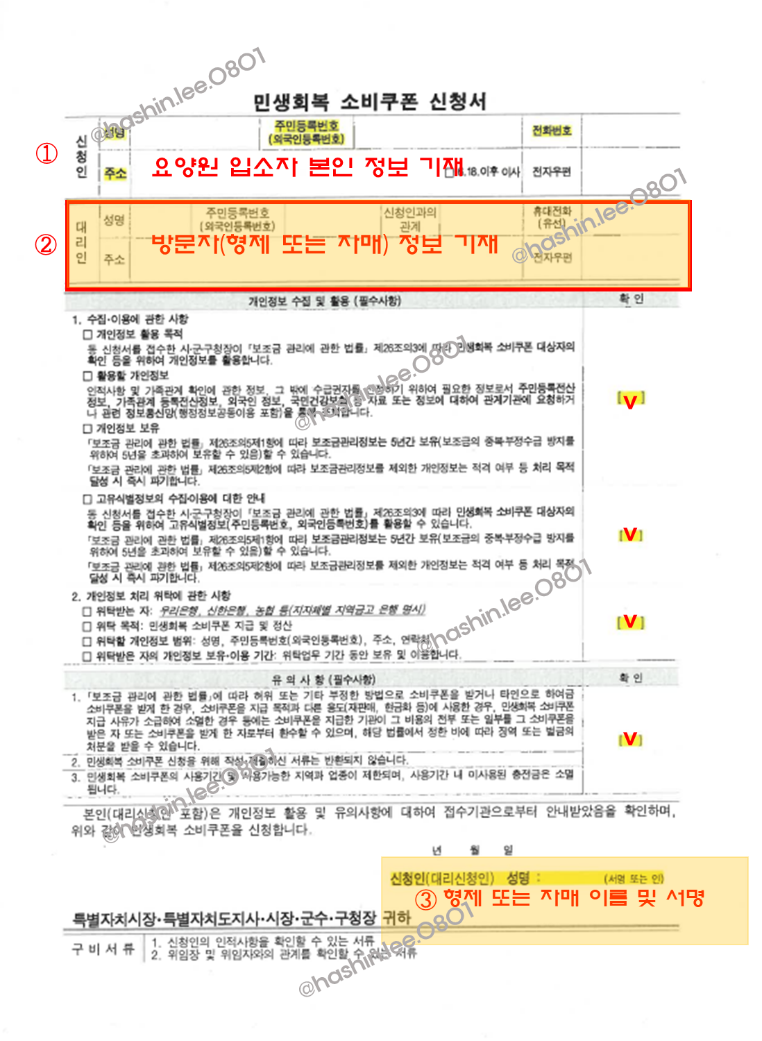 여기까지 요양원 입소자의 민생회복 소비쿠폰을 형제자매가 대리 신청하는 방법에 대해서 알아보았습니다. 일반적인 대리인의 범위를 넘어 형제자매도 대리하여 신청할 수 있으니 참고해 주세요.