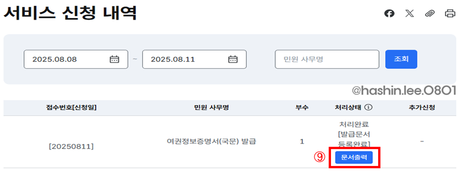 ⑨ 문서출력 버튼을 클릭해서 해당 서류를 출력한다.