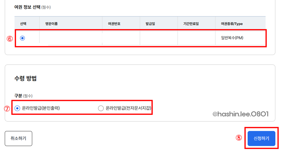 ⓐ 여권 명의인 정보 작성 – 성명, 생년월일, 주소, 전화번호
