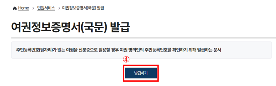 ④ 여권정보증명서(국문) 발급"발급하기"버튼 클릭