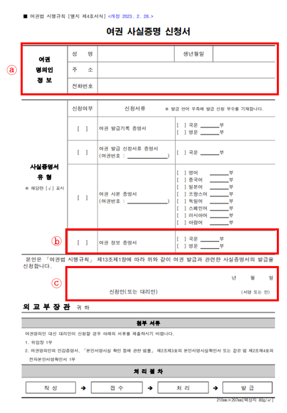 ⓒ 신청날짜 및 신청인(여권 명의인 또는 대리인) 이름 작성 및 서명 또는 도장 날인