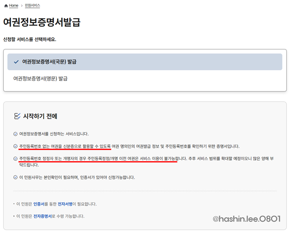 ※ 주민등록번호 정정자 또는 개명자의 경우, 민등록정정/개명 이전 여권은 서비스 이용이 불가능